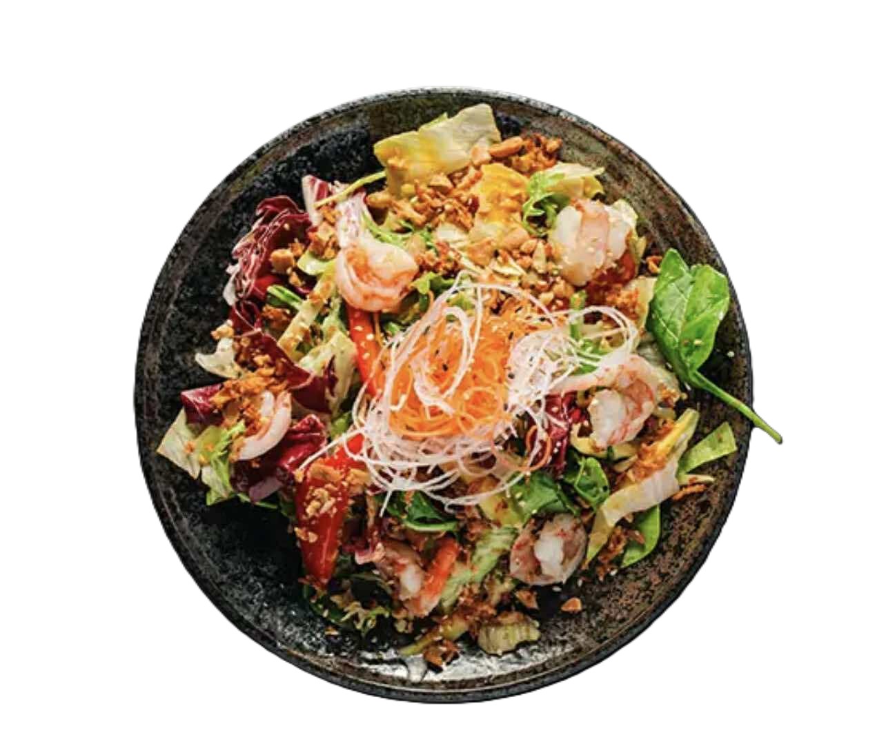 Frischer Mangosalat mit Gurke, Salat und Erdnuss-Limetten-Kräuter-Dressing. 2,5,6