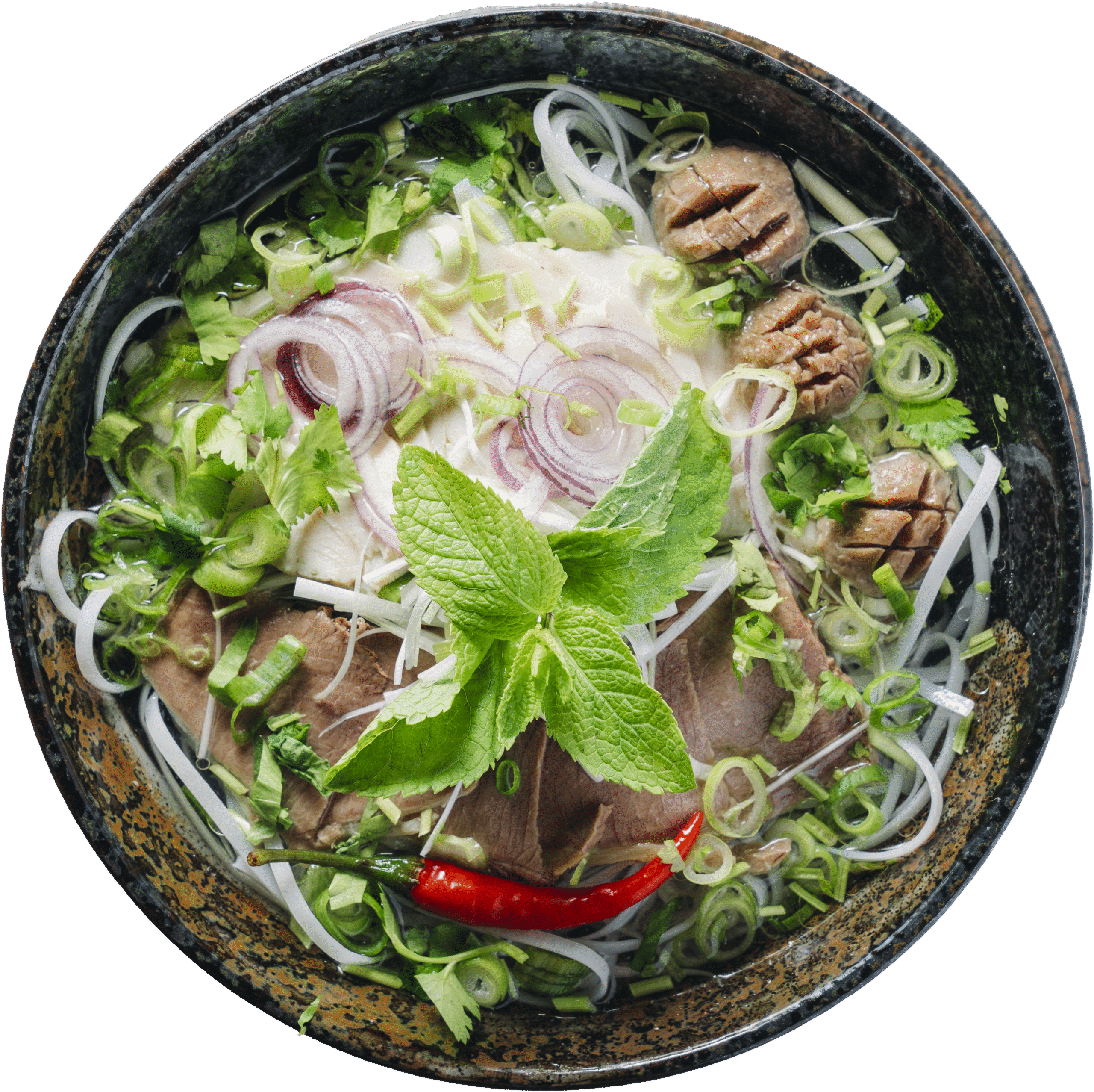 Reisbandnudelsuppe mit Sojasprossen, Koriander und Zwiebeln nach vietnamesischer Art, aromatisiert mit 5 verschiedenen Gewürzen.6