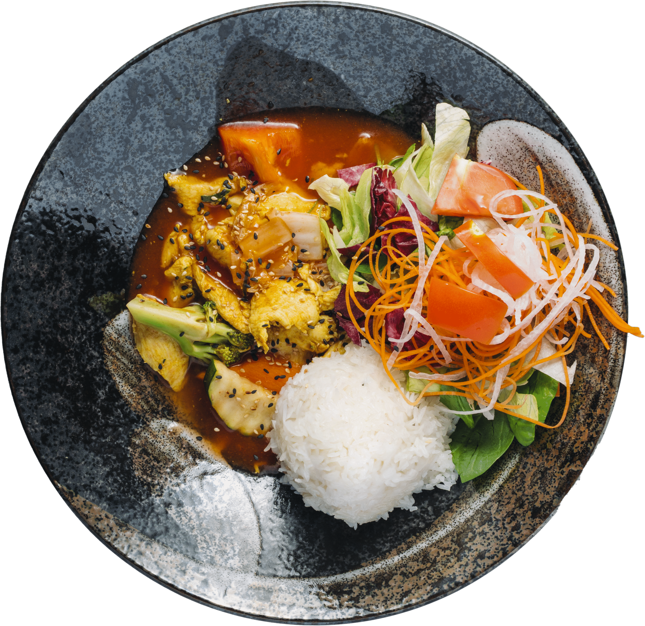mit verschiedenem Gemüse, Tomaten, Ananas, Kartoffelmehl, serviert mit Reis. 1,2,3,6
