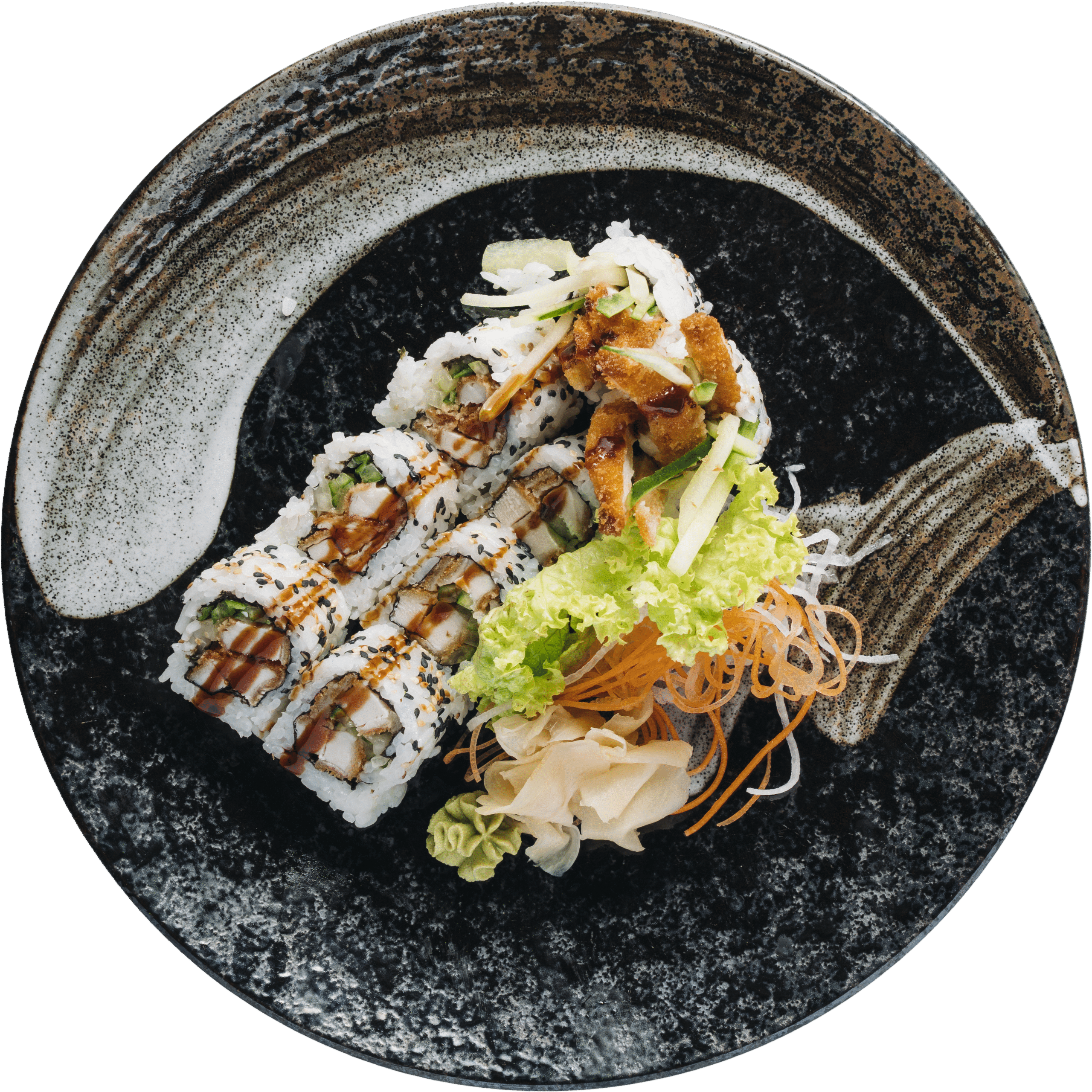 Garnelen Tempura, Gurke, Cream Cheese, außen mit Sesam und Fischrogen.1,2,3,7,11,Tbk