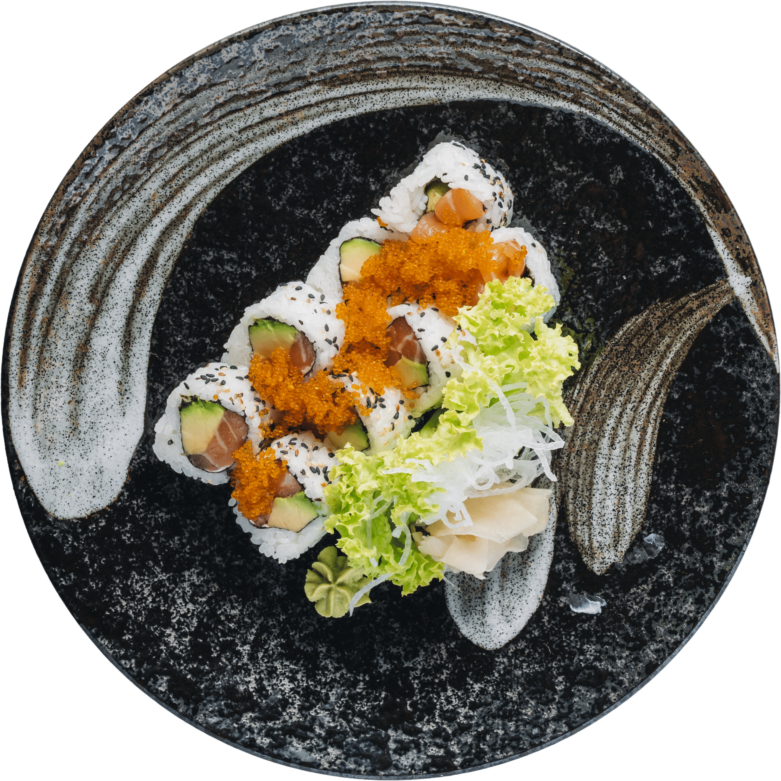 Krebsfleischimitat, Avocado und Cream Cheese, außen mit Sesam und Fischrogen. 4,11,7,Srm,Tbk .