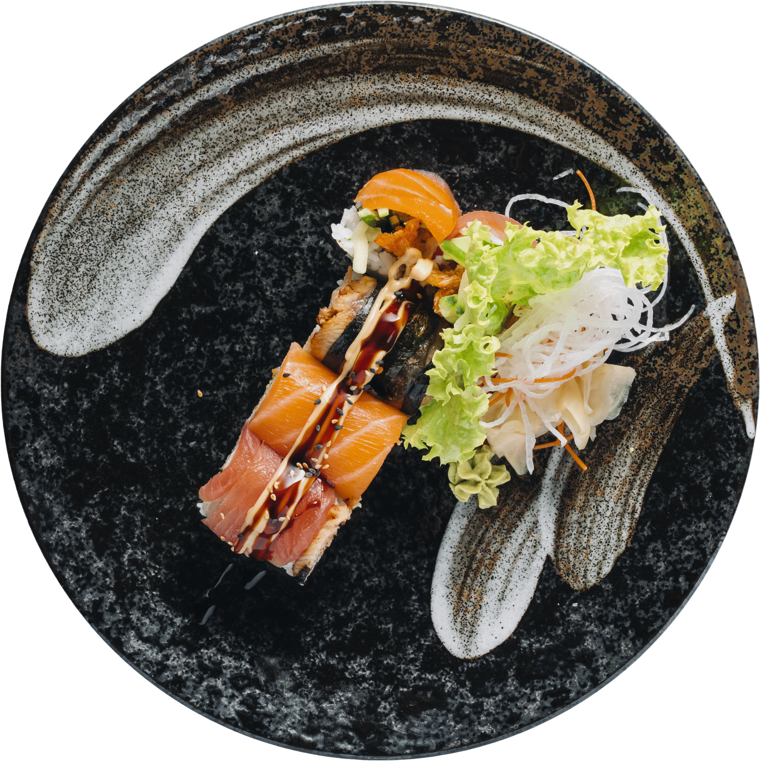 Innen: Ebi Tempura, Avocado, Gurke, Cream Cheese, Umwickelt mit: Lachs, Thunfisch, Aal.1,2,3,4,7